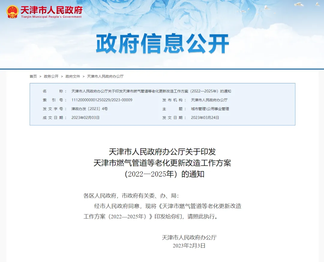 今日,天津政务网发布了《天津市燃气管道等老化更新改造工作方案(2022—2025年)》。方案中明确: