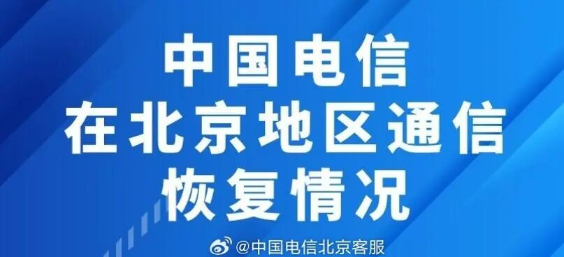 目前,中国电信在北京地区的主要骨干光缆运行正常,受强降雨和洪水、山洪、地质灾情影响,部分郊区无线通信正在紧急抢修恢复中。